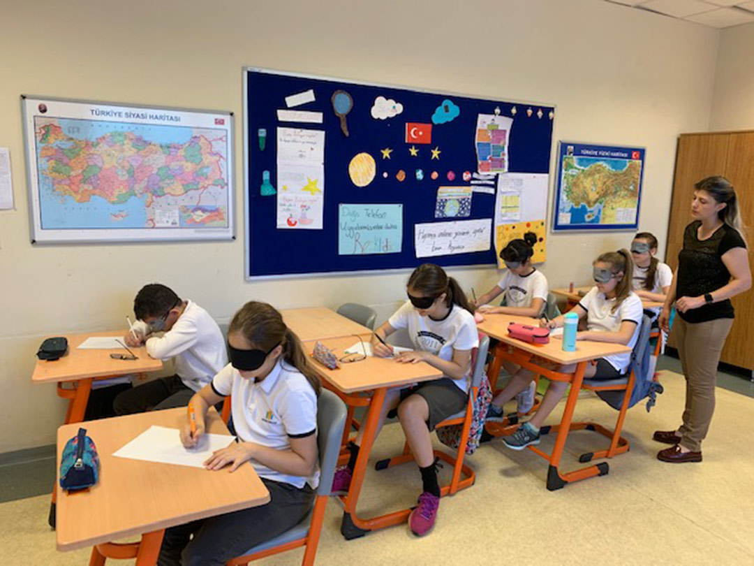 Fen Bilimleri dersi Ortaokul zümresi olarak 10-16 Mayıs Engelliler Haftası dolayısıyla öğrencilerimizle engelli bireyleri fark etmeleri, duyarlılık geliştirmeleri; hatalı inanç, düşünce ve davranışlarını en aza indirgemeyi amaçlayan etkinlikler düzenledik. Öğrencilerimizin Türkan Saylan Engelliler Okulundaki görme engelli olan 6. sınıf öğrencilerine akran empatisi amacıyla tanışma mektubu yazdırdık. Görme engelli bireyleri anlayabilmeleri adına herhangi bir yere bir cisim hedef olarak konulup öğrencilerin hedefi tek seferde bulmasını istedik. Yine görme engellileri anlayabilmeleri için öğrencilerimizin gözleri bağlanarak verilen kâğıtlara “Engel Olma Farkında Ol” gibi sloganlar yazdırdık. Etkinlik sonunda öğrencilerimize neler hissettiklerini sorarak bedensel engelli bireylere karşı kazandıkları farkındalıklarını öğrendik.