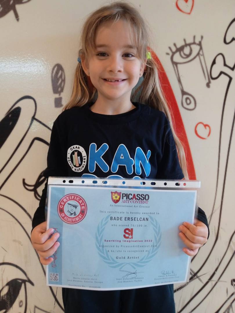 1.sınıf öğrencimiz Bade Erselcan PicassoArtContest.com tarafından düzenlenen Picasso Uluslararası Resim Yarışmasında Altın Ressam olarak sertifika almaya hak kazanmıştır.
