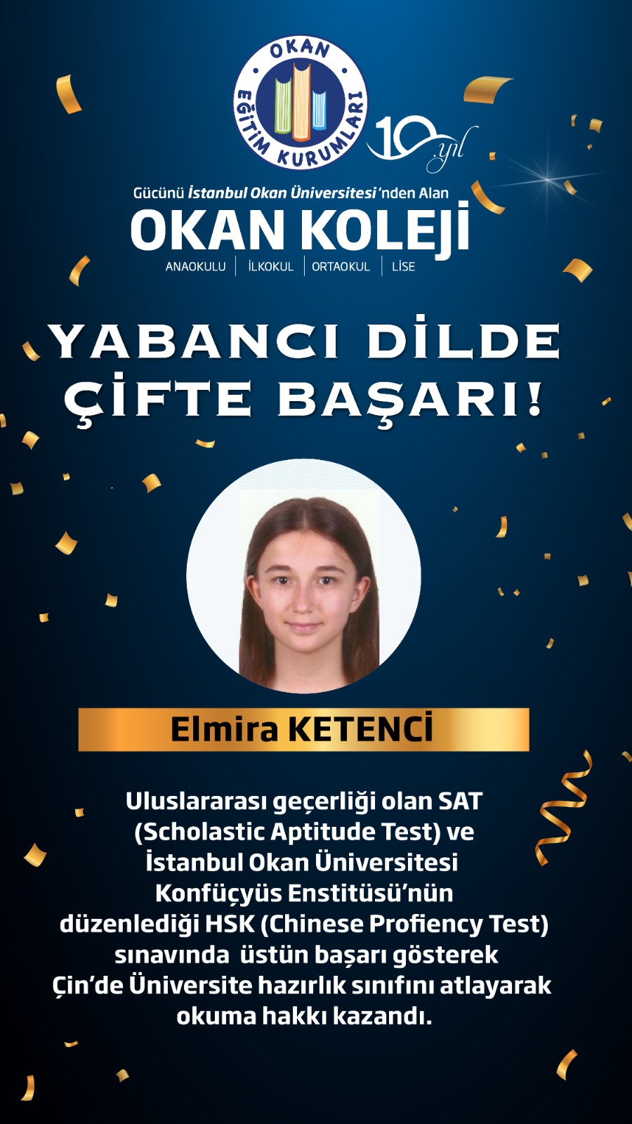 12. Sınıf Öğrencimiz Elmira KETENCİ İstanbul Okan Üniversitesi Konfüçyus Enstitüsü’nün 10.04.2021 tarihinde düzenlediği HSK (Chinese Profiency Test) sınavında üstün başarı göstererek Çin’de Üniversite hazırlık sınıfını atlayarak okuma hakkı kazandı.